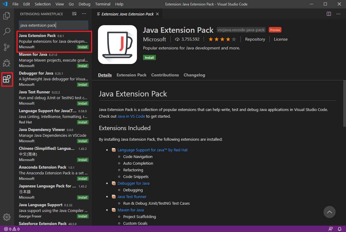 3. VSCode -> Extensions(Ctrl + Shift + X) -> Java Extension Pack 검색 -> Install