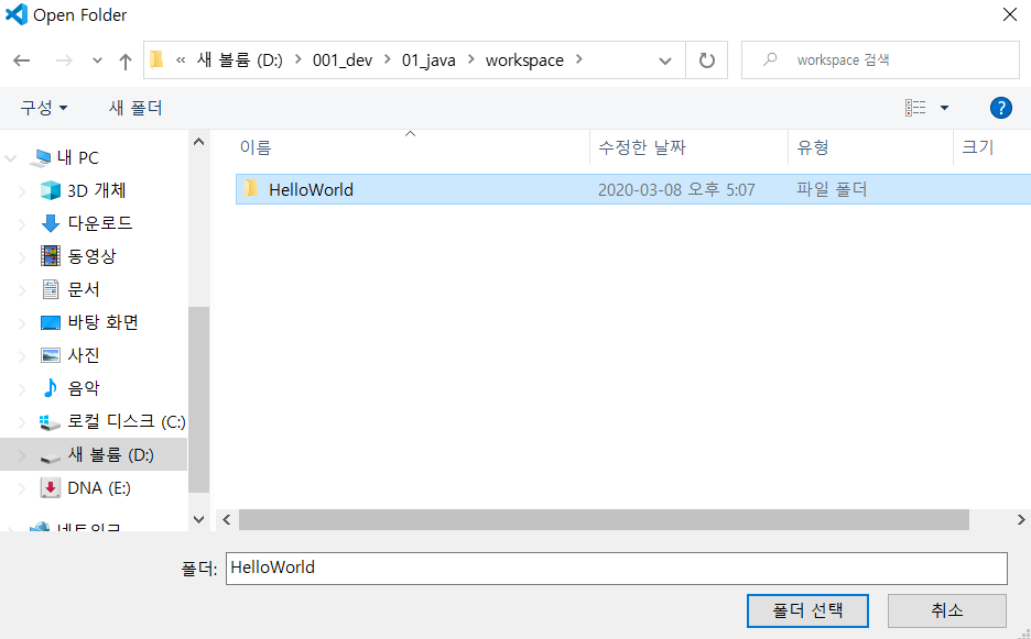 Open Folder -> 새로 만들기 -> 폴더 선택