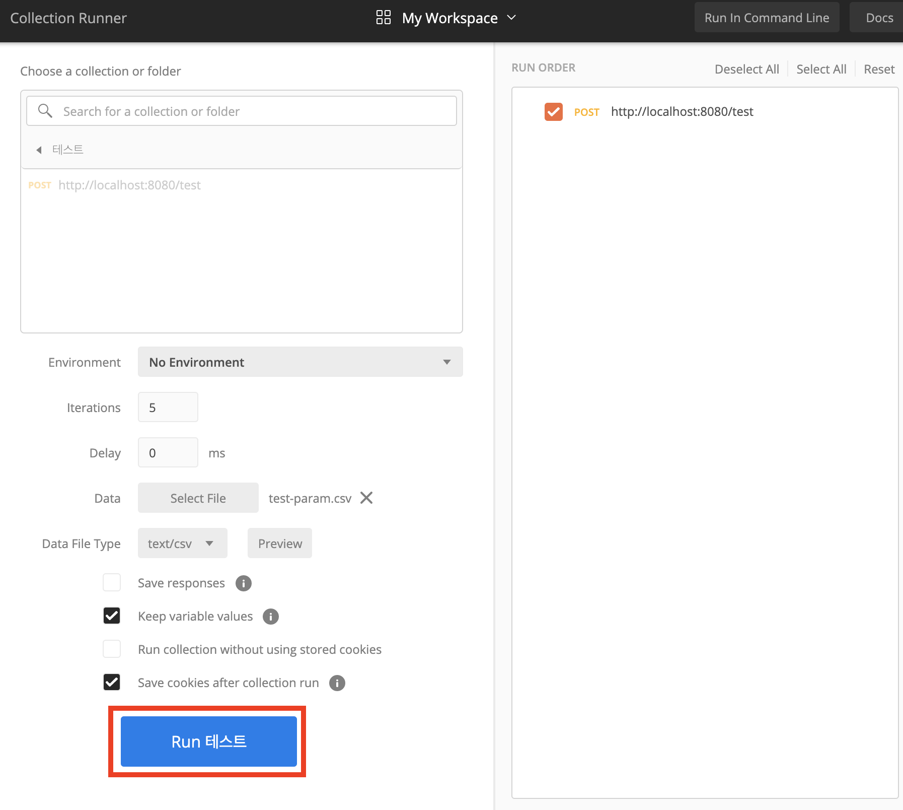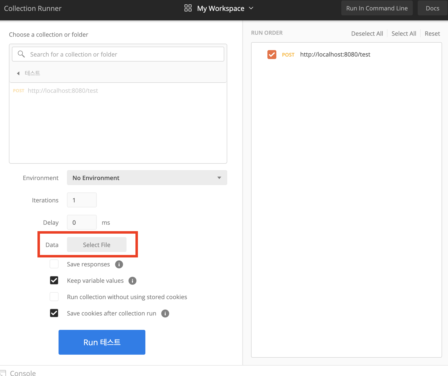 6. Collection과 Request 선택 후 Select File 에서 csv 파일 선택