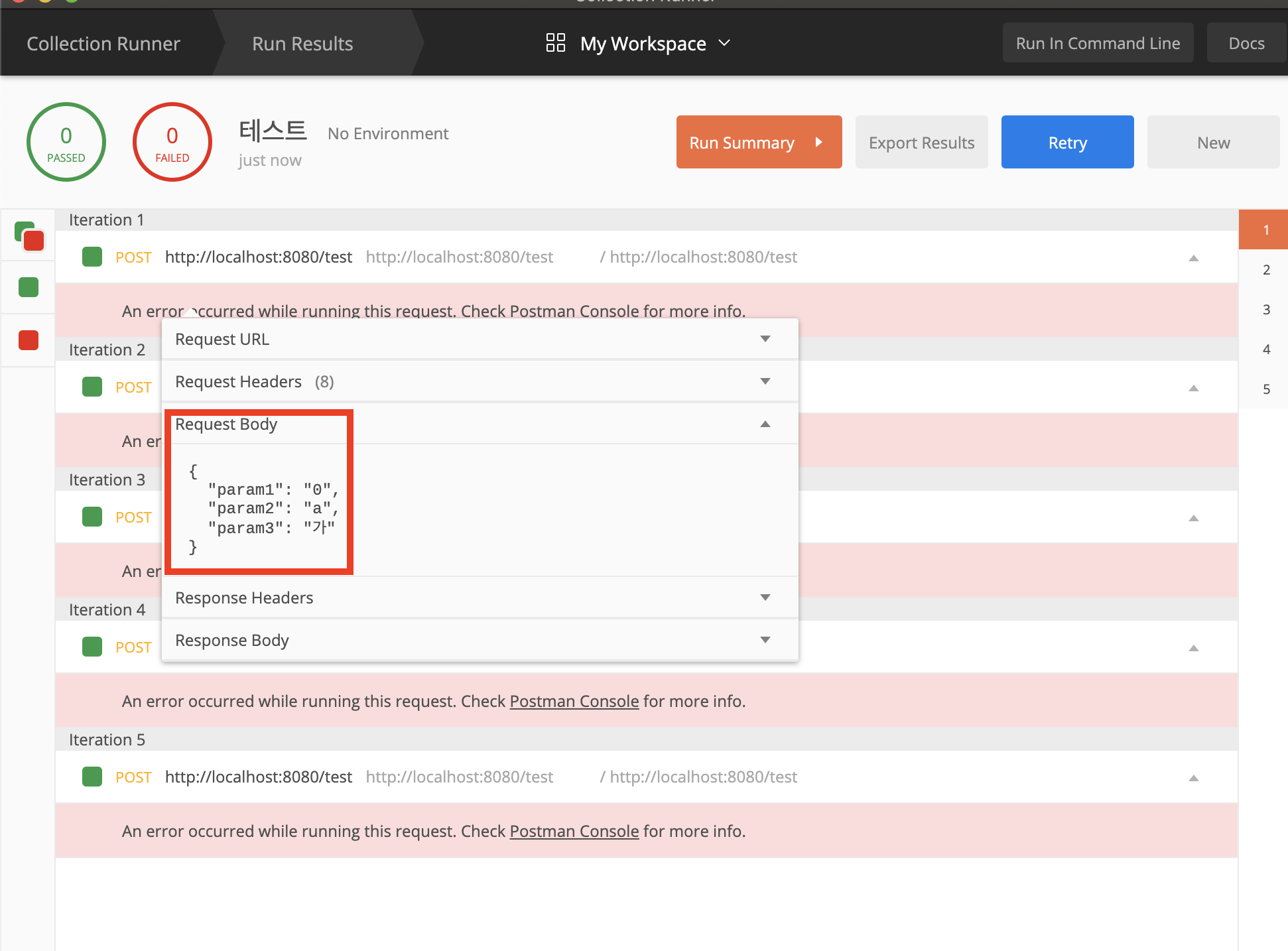 이 때 Postman의 Runner를 이용하면 다양한 데이터를 이용해서 API 테스트를 해야할 경우에 사용할 수 있다