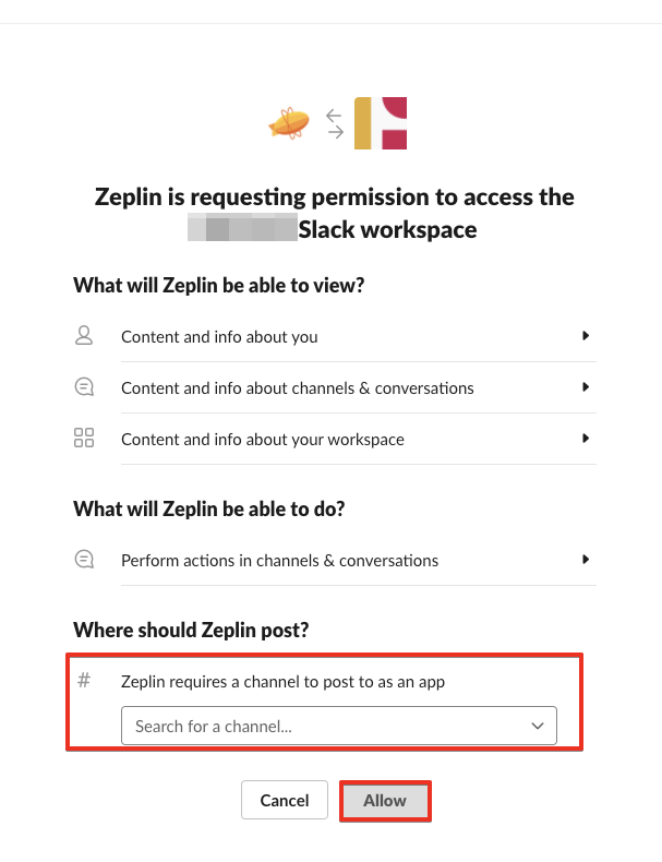 3. 연동하고자 하는 슬랙 워크스페이스 확인 및 슬랙 채널 선택 -> Allow 클릭