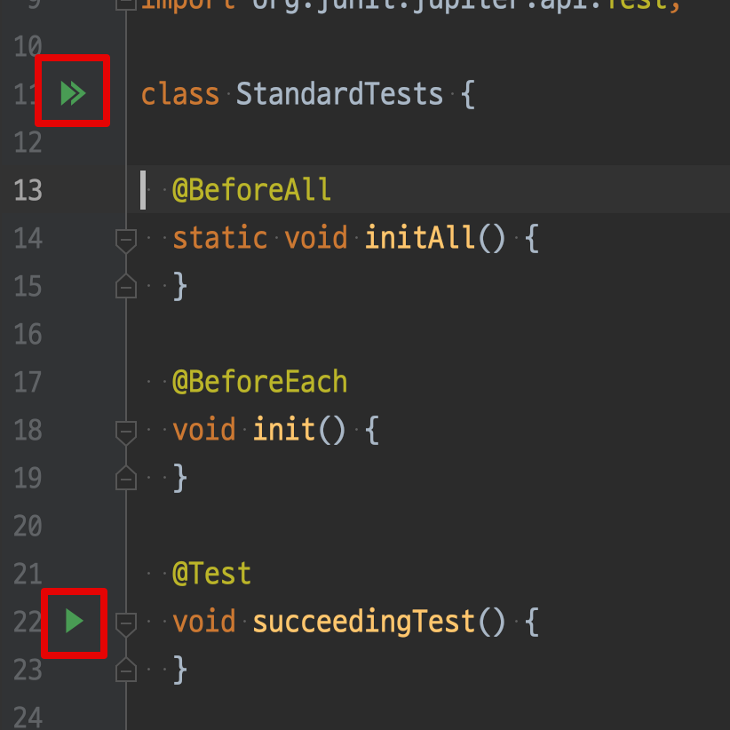클래스 옆에 있는 겹쳐진 세모 클릭 : 클래스에 속한 테스트 모두 실행