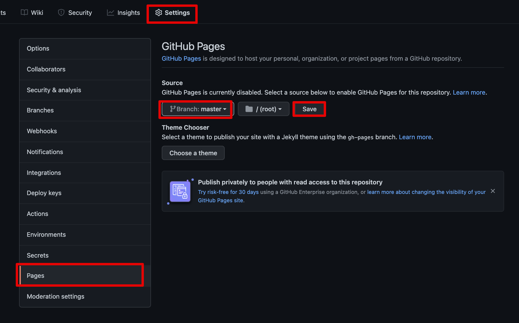 7. GitHub 저장소 Settings -> Pages -> Source 선택 후 저장